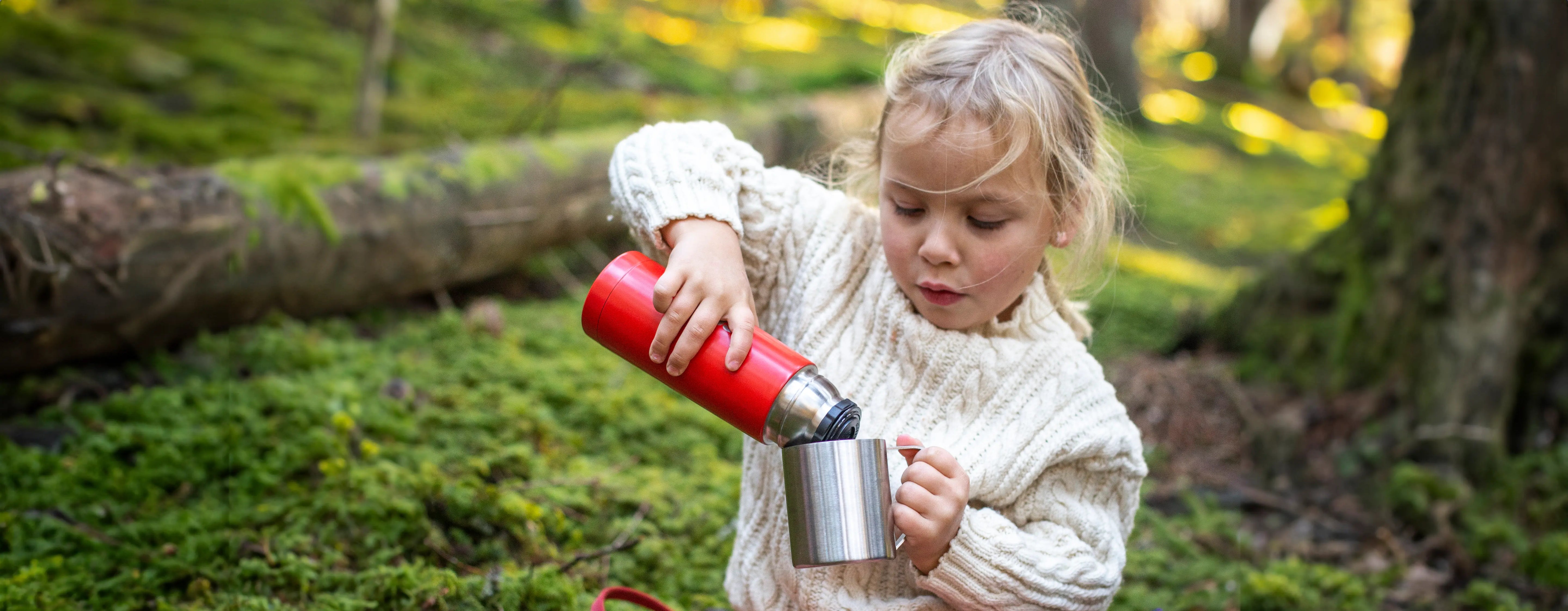 Meals deserve a little extra care, but without going to the trouble of looking for the “perfect spot.” Dig a picnic pit if there's snow (a small shovel is good to have). Or find another good location – preferably with a view – to lay out a picnic blanket or mats to sit on. Let your child decide how it should be. Here, you can eat a packed lunch or cook together in the big kitchen. It's more fun if the child can help, so adjust the task according to ability.