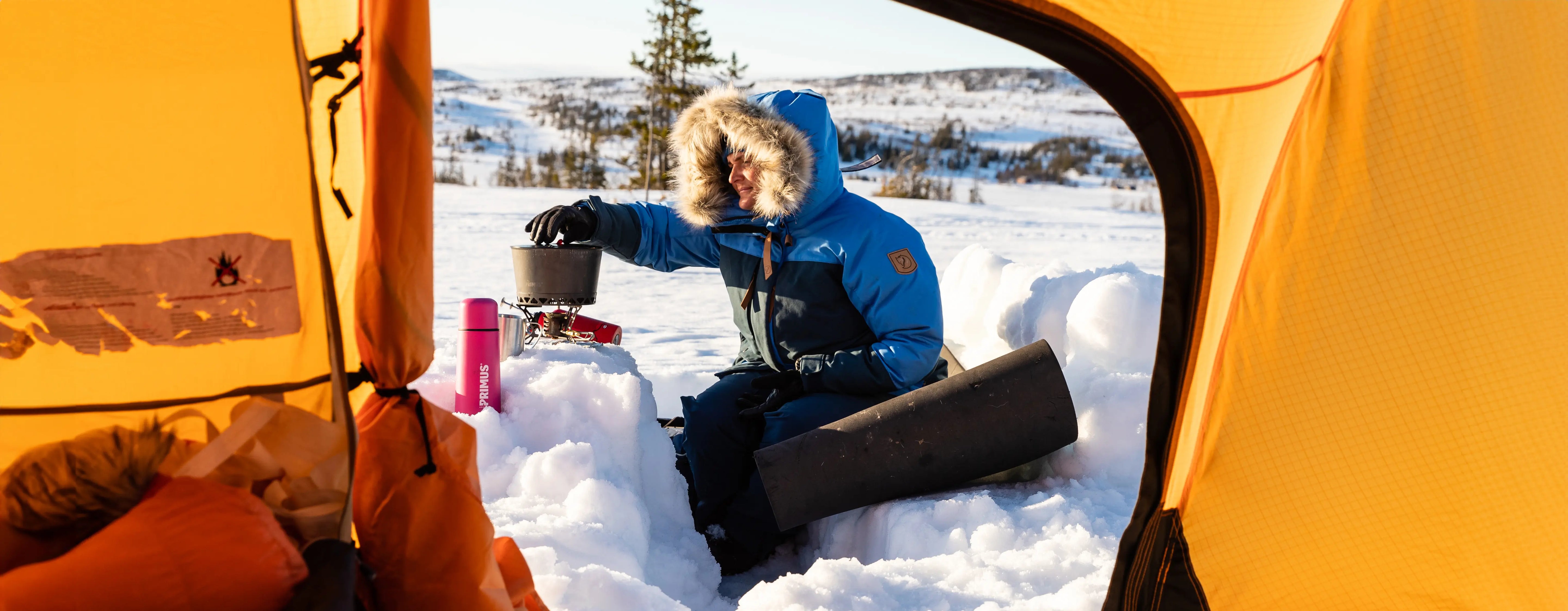 “I wouldn't last a day without the kitchen,” says Lina as she lights up with a Powerlighter. "I have to turn snow into water, and I have to get hot food and drinks. I use the kitchen morning and evening. While eating breakfast, I prepare my lunch, which I then store in a Primus lunch jug. It's important to turn the fuel bottle over and wait until it burns out and the pressure is gone. From time to time, I need to clean with the cleaning needle to remove soot.”