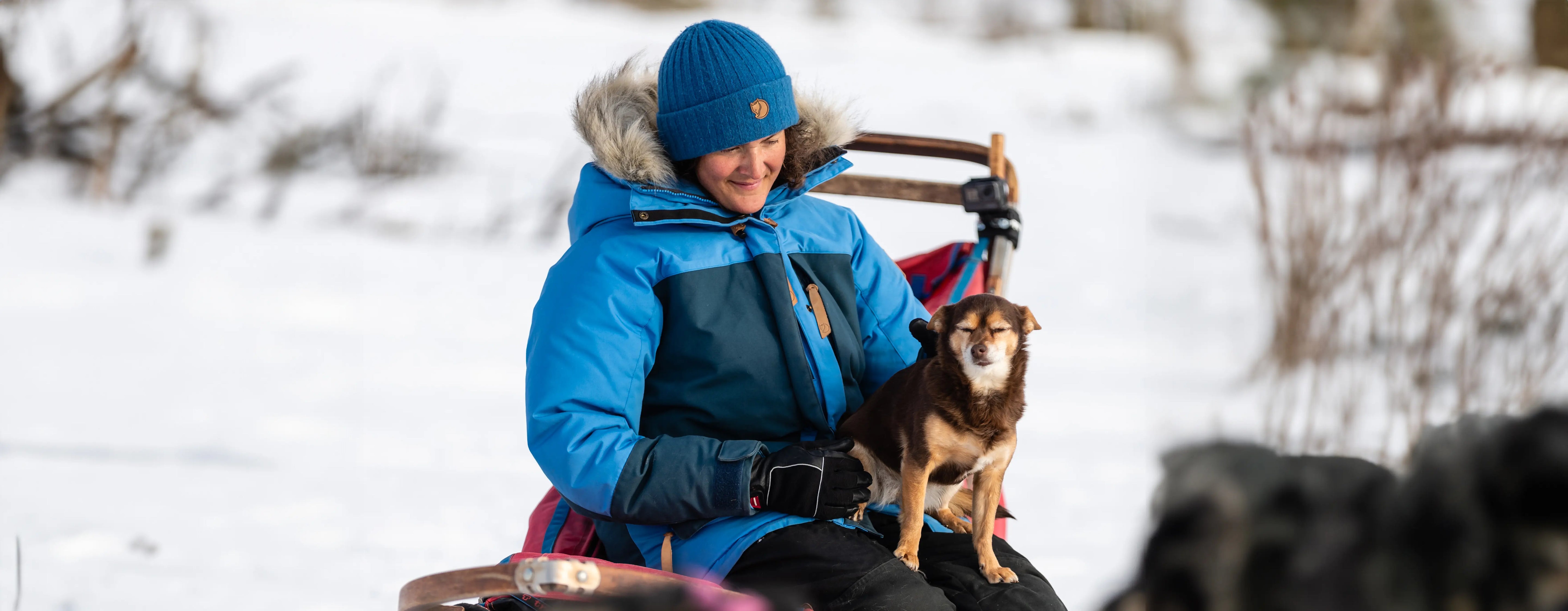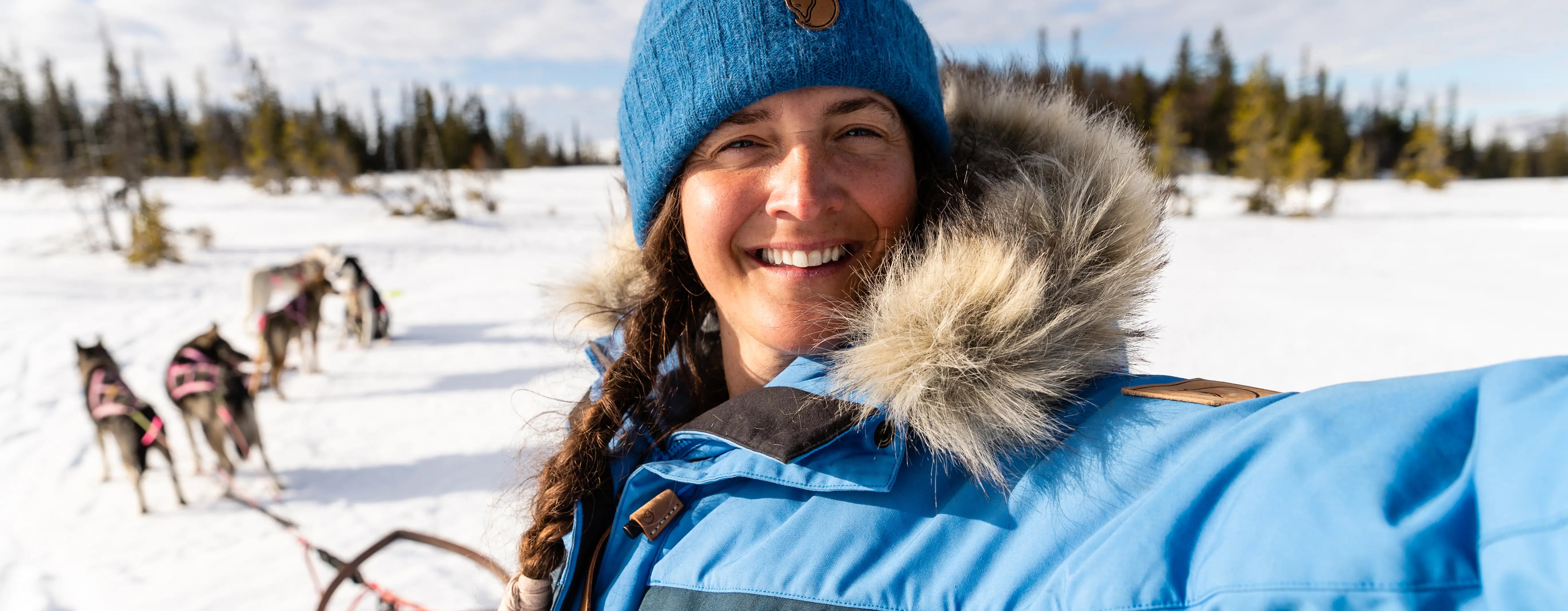 In recent years, her long adventures have consisted of winter dog sledding trips. When Primus meets her, she is on a 70-day trip in the mountains with the dogs Peak, Isbjörn, Ynk, Tofslan, Halvar and Libbie. In addition to the sled dogs, Lina has Bounty with her.