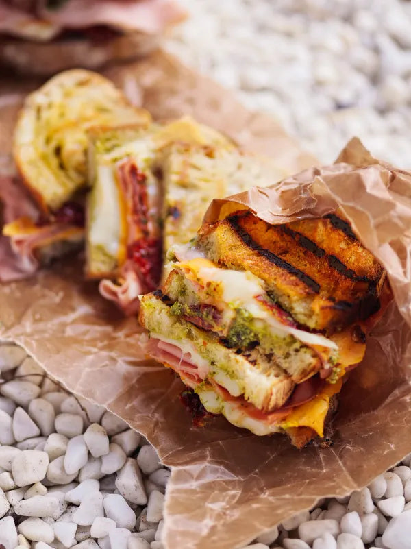 Grilled cheese” Italian Style” with mortadella, pesto and creamy taleggio. Prepare the paninis at home and brush with olive oil. Can be eaten on the go but be careful! When pressured, the melted taleggio tends to erupt.