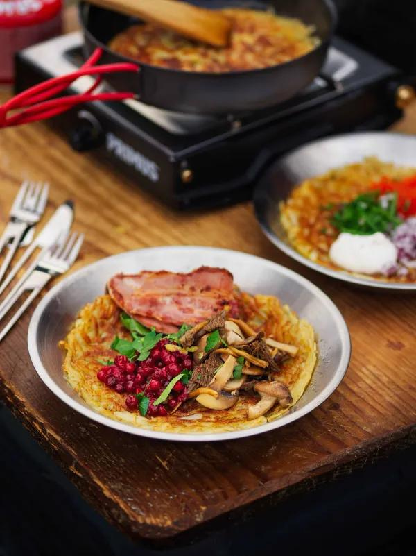 The world’s simplest and cheapest luxurious dish. The sizzling from frying a hash brown is soothing and will enhance any outdoor experience, bring joy and peace of mind. It doesn’t really matter what you put on top, but here’s two classics.
