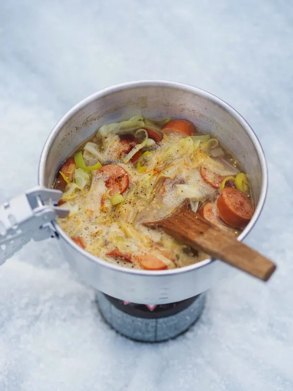 Simple, delicious, and best enjoyed overlooking the Nordic Mountain landscape. This sausage stew is the perfect outdoor dish, inspired by the Swedish classic Nikkaloukta Soup which is made of minced beef, cabbage, and leek. In this simplified version, beef is replaced with sausage, and we added some beer.