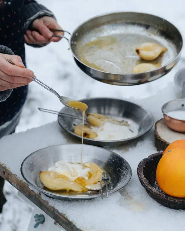 The perfect finish of a day outside. Poached pears with creamy caramel, crunchy almonds and smooth cream.