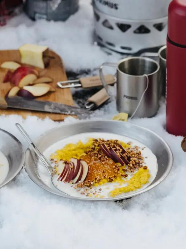 Serve the porridge and top with apples, the toasted buckwheat, cloudberry jam and oat milk.