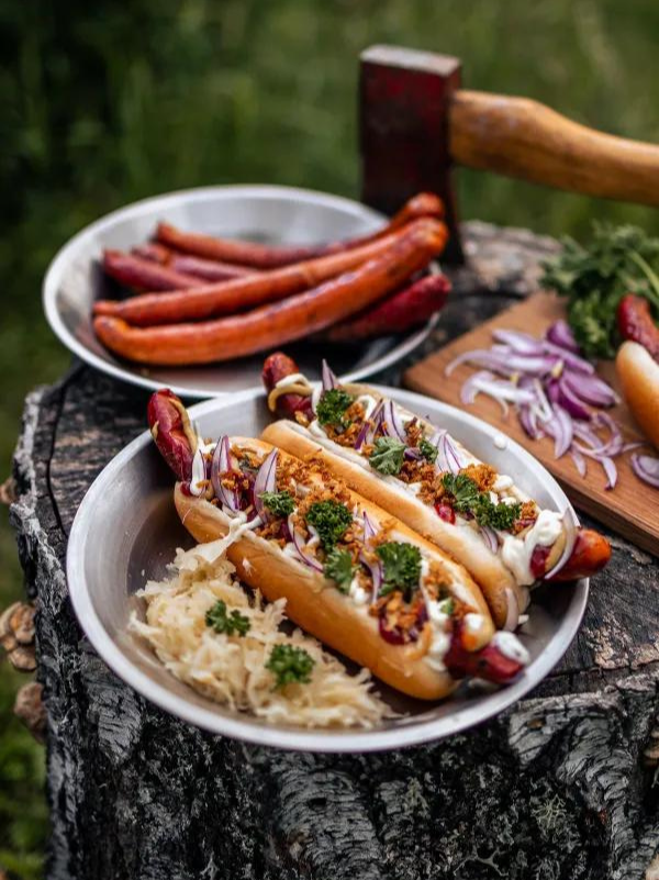 Sausage on a hot dog roll is a great combo. Whether it’s weekday lunch or dinner after a day in the woods. Of course, sausages are best grilled over an open fire and if you’ve never tried making your own gherkin relish before, you’ll absolutely love it!
