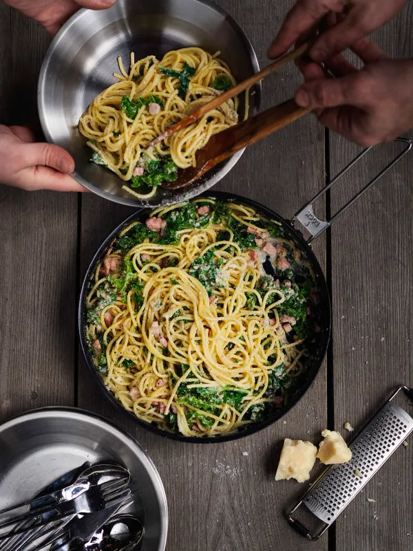 There are many rules for what a real pasta carbonara should look like. This creamy sunflower seed pasta breaks them all. The fattiness from the creamy sauce goes perfect with the salty pork while the kale provides a nice balance. Tastes better when surrounded by a spruce forest.
