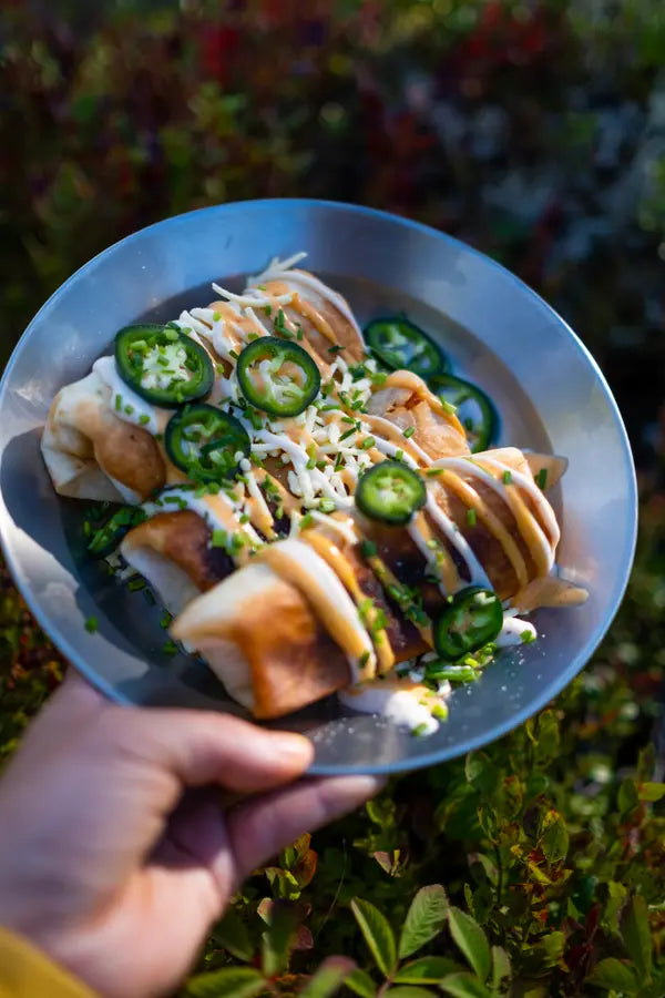 Finish by topping with garlic dressing, grated cheese, Sriracha mayo, jalapeños and chives.
