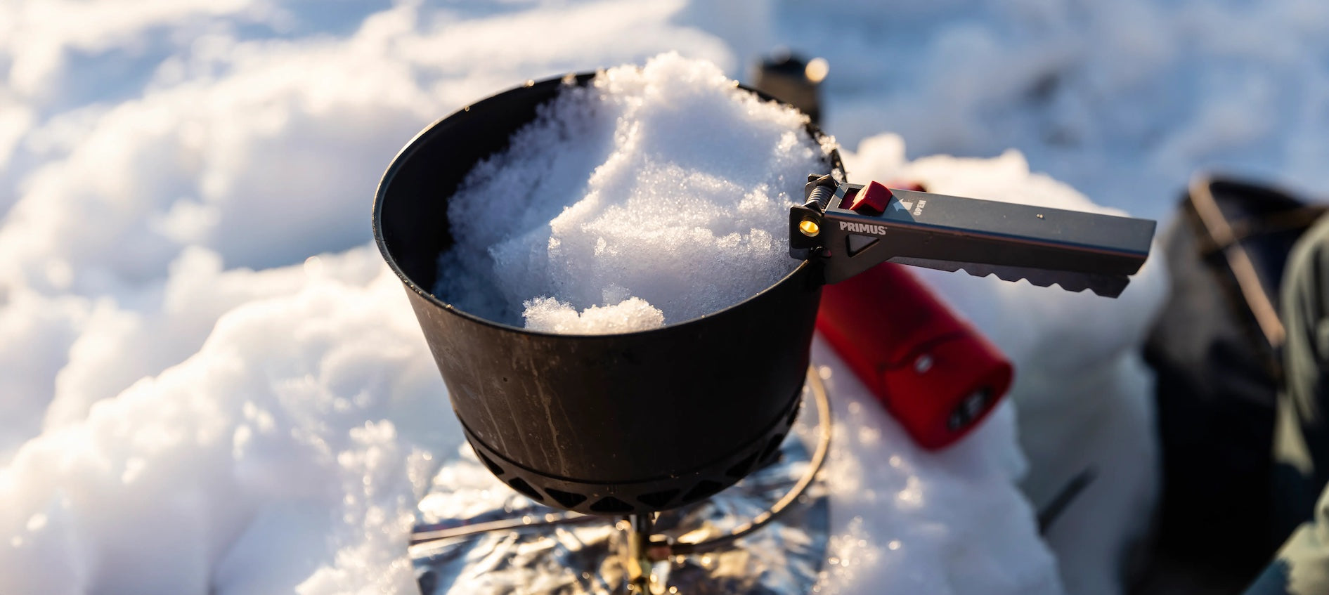 It takes a lot of snow to melt water. It is therefore a good idea to use large pots with lids and windscreens that retain as much heat as possible. Don't heat the snow at too high a temperature at the beginning, as this can burn the pot. Once a little water has collected in the bottom of the pot, you can increase the heat.