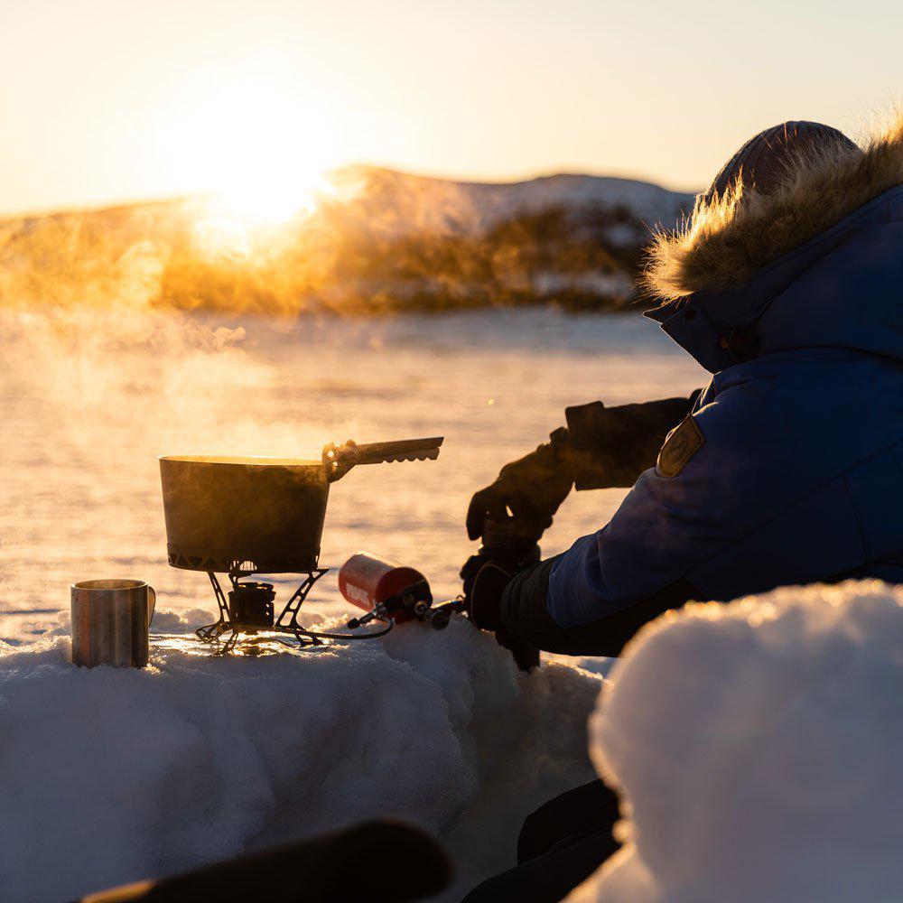 Having the appropriate kitchen equipment for your winter expedition can significantly enhance your comfort and convenience in the cold. Start by choosing a reliable stove that performs well in low temperatures. The same applies to fuel that has to function reliably in cold weather. An example is the Primus Winter Gas which we developed to increase the performance of gas stoves at lower temperatures.