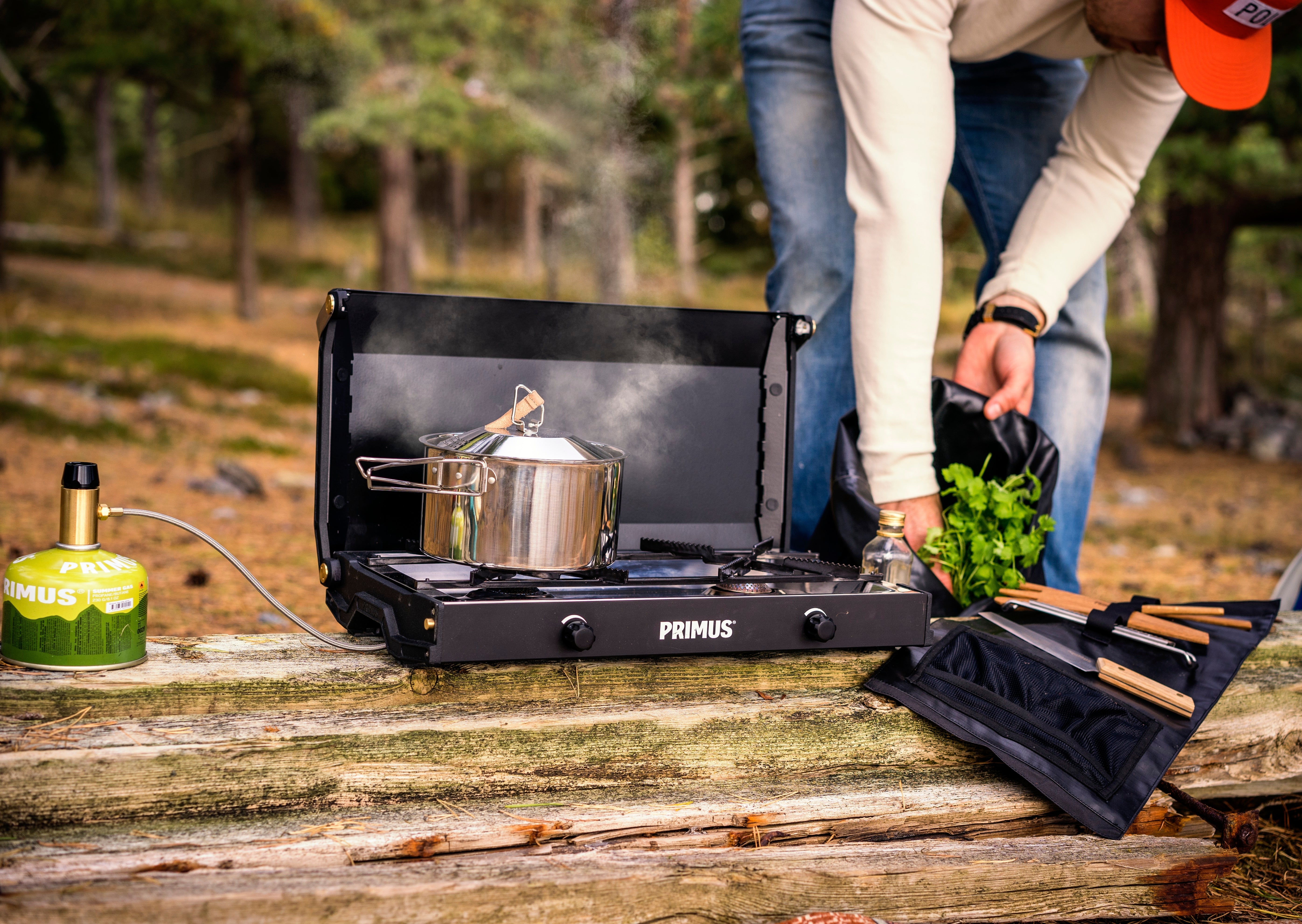A compact and practical camping stove with dual burners for outdoor cooking for 2–5 people.